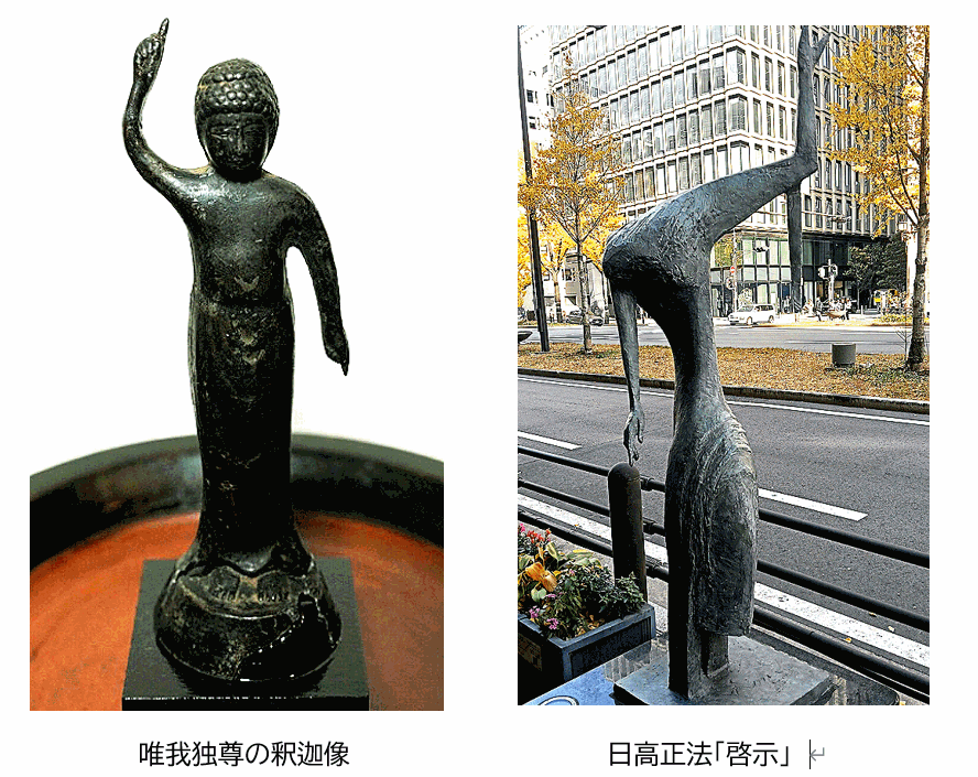 その身振りから、誕生仏、唯我独尊の釈迦像が思い浮かぶ。しかし似ているのは、形の輪郭だけである。信仰を支えるための物語も、象徴も、ここにはない。似ているが、帰属先がまったく異なる。その差異こそが、この像の出発点である。