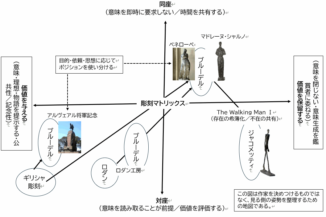 このマトリックス上で見ると、アルヴェアル将軍記念碑は「対座 × 価値付与」に、「ペネロペ」は「同座 × 価値保留」に位置づけられる。ブールデルは、作品の目的・依頼・思想に応じて、このポジションを使い分けた。
