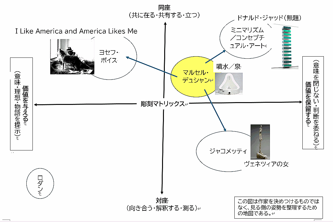 そのために用いるのが、私自身が整理した「彫刻マトリックス」である。このマトリックスは、彫刻を「対座/同座」・「価値を与える/価値を保留する」という二つの軸で捉えるものであり、作家や作品を固定的に分類するための図ではない。