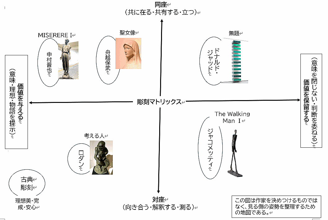 ただし重要なのは、これは作品を固定的に分類するための表ではないという点である。彫刻マトリックスは、鑑賞者が像の前に立ったとき、自分はいま、判断を求められているのか、あるいは保留してよいのかを確認するための枠組みなのである。