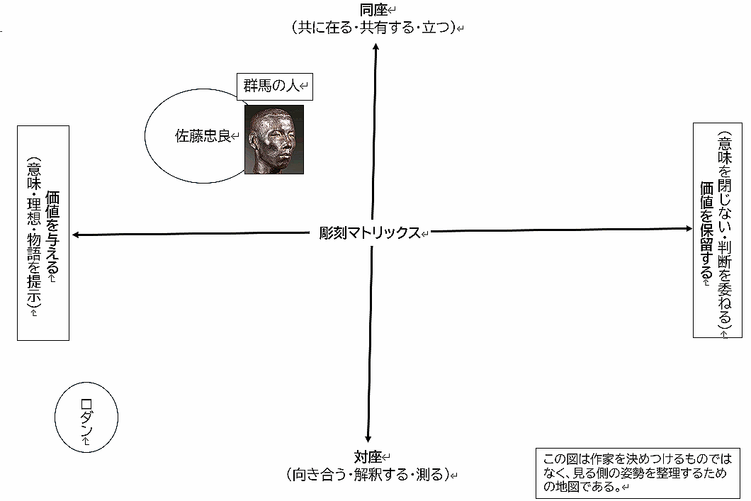 この「同座」という座標を、彫刻マトリックスとして〈対座/同座〉×〈価値を問う/価値をあたえる〉の二軸で捉えるならば、佐藤忠良の位置は明確である。彼は一貫して「同座・価値をあたえる」という象限から動かなかった。