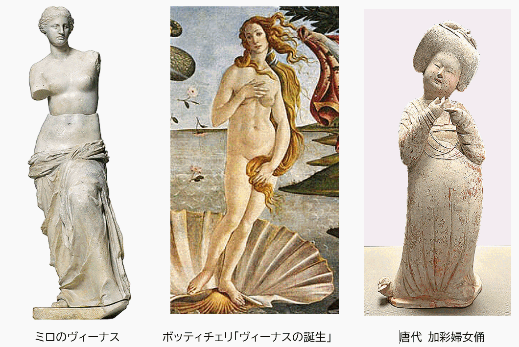 ミロのヴィーナス、加彩婦女俑、「ヴィーナスの誕生」を並置すると、文化・時代・素材の差を越えて共通する構造が浮かび上がる。それは、片脚への重心移動が生む自然なS字曲線であり、静と動が同時に存在する“人間らしい立ち姿”である。コントラポストは西洋美術の専門用語でありながら、その構造自体は人間の身体の自然性に根ざすため、文化をまたいで同様の姿勢が自生するのである。