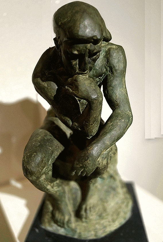 この特徴は、「考える人」において最も端的に現れている。一見すると、この像は「思索する人間」という明確な主題を持つように見える。しかし、よく見ると、彼が何を考えているのかは像の造形そのものからは決定できない。思索なのか、苦悩なのか、沈黙なのか、あるいは行為の直前の緊張なのか――いずれの解釈も可能であるが、いずれも確定しない。