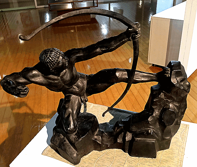 この特質は、「弓を引く人」において、きわめて明確に示されている。像は、弓を引き絞る瞬間に固定されているが、そこには勝利や達成の表情はない。むしろ、全身に張り巡らされた筋肉の緊張、足元にかかる体重、弓の反発力に抗する身体の踏ん張りが、造形として前面に押し出されている。