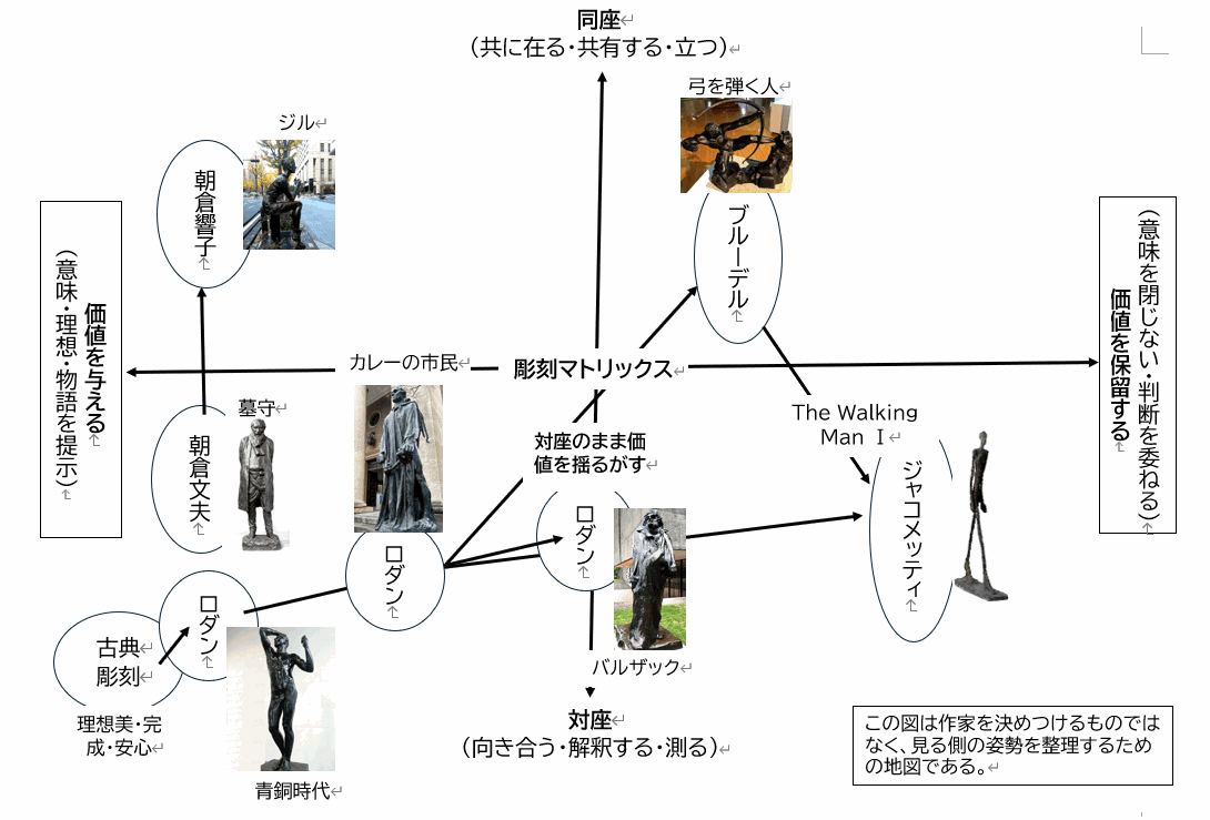 彫刻は、もはや完成された答えを与える芸術ではない。代わりに、鑑賞者に「どう立つか」「どの姿勢を引き受けるか」を静かに問い返してくる。このマトリックスは、その問いに迷ったとき、現在地を確認するための足場となる。